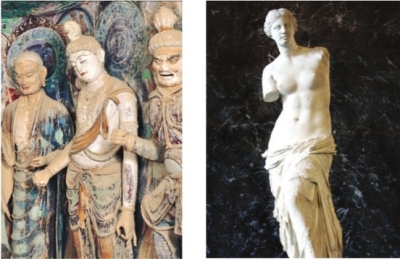 可是,“脅侍菩薩微笑著,在她低垂的眼中可能根本沒有勝負(fù)這回事。這種眼神是利他而非個人的……當(dāng)我們在45窟佛龕前微微俯下身子之時,溫暖的奇跡出現(xiàn)了,她正慈祥地看著你。一位是由堅硬的大理石所雕,另一位是由敦煌本地黏土所塑,維納斯和脅侍菩薩似乎代表了兩種生活態(tài)度。假如她們在盧浮宮中相遇,談?wù)撈鹈馈>S納斯可能會唱起女詩人薩福的詩歌:‘你愛的就是美的。這容易解釋。’脅侍菩薩則依然保持微笑,靜靜地看著維納斯”。