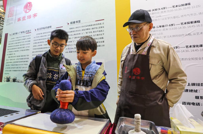 11月17日,參觀者在第十屆中國上海國際童書展現(xiàn)場體驗(yàn)活字印刷。