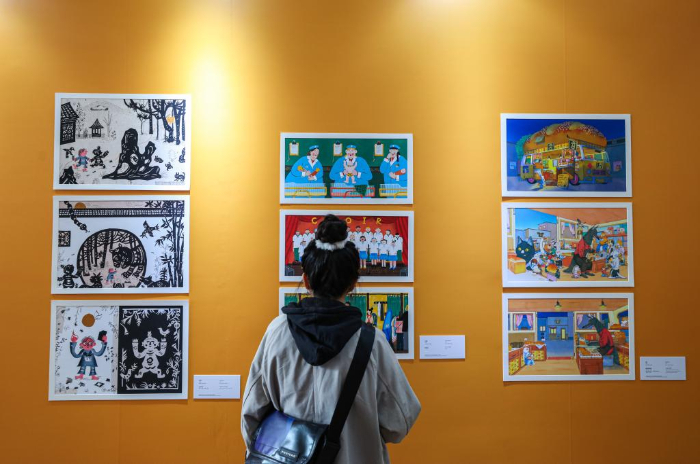 11月17日,參觀者在第十屆中國上海國際童書展現(xiàn)場觀看“2023金風(fēng)車國際青年插畫家大賽”參賽作品。