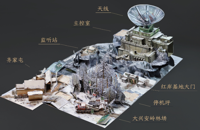 如果說《三體》是關于宇宙最狂野的想象,那《三體立體書 紅岸基地》就是將這份想象轉化為了可觸摸、可視化的閱讀體驗。這本書采用全景展開的裝幀方式,還原從大興安嶺林場、紅岸基地、到齊家屯的整個地圖,全書展開后近1.5平方米,小立體頁和豐富有趣的互動機關則暗藏細節(jié),使故事結構更為完整。為了確保立體書最終呈現(xiàn)出來的效果,在做立體紙藝設計的時候,施鎮(zhèn)宇挑戰(zhàn)立體紙藝結構畫幅極限,創(chuàng)新性采用二段式結構,搭建出約0.5米高的紅岸基地巨型天線,帶來震撼的閱讀體驗。