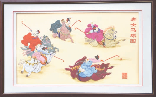 北京補(bǔ)繡代表作《唐女馬球圖》,色彩明艷,動感十足。