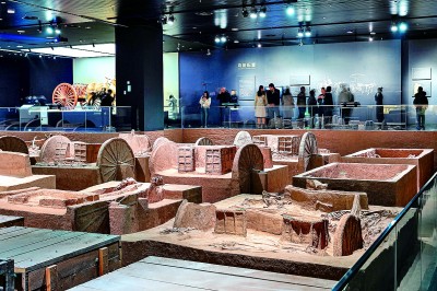 在二樓展廳展出的名為“陶”的文物,形狀呈圓餅狀,表面微微凸起,密密麻麻,這是商朝人洗澡時(shí)的清潔用具。殷墟考古發(fā)掘工作中,發(fā)現(xiàn)一種車,車前俯身埋著兩個(gè)人,這很可能是一種人力車,文獻(xiàn)稱為“輦車”。在“車轔轔,馬蕭蕭”展廳,社科院考古所現(xiàn)場考古,把發(fā)掘過程展示給游客。