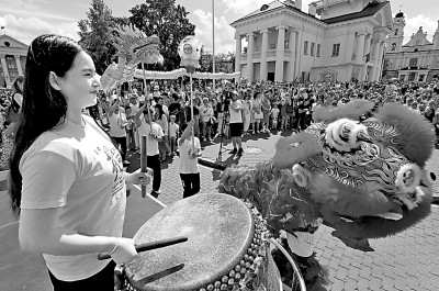 6月1日,白俄羅斯孔子學(xué)院師生在明斯克“茶和天下·雅集”活動上表演舞龍舞獅。新華社發(fā)