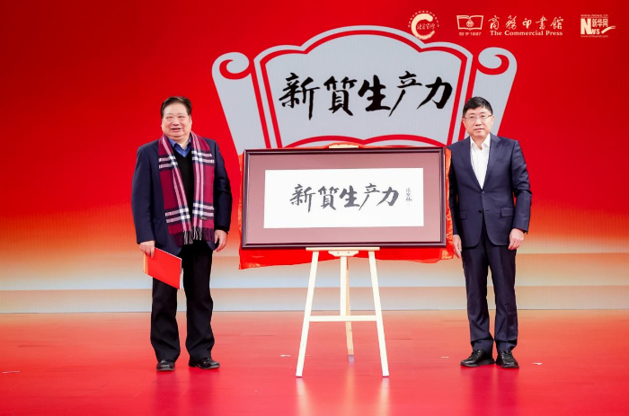 中國辭書學(xué)會會長、北京語言大學(xué)教授李宇明(左),中國出版集團有限公司副總經(jīng)理、黨組成員陳永剛(右)揭曉年度國內(nèi)詞“新質(zhì)生產(chǎn)力”。新華網(wǎng) 發(fā)