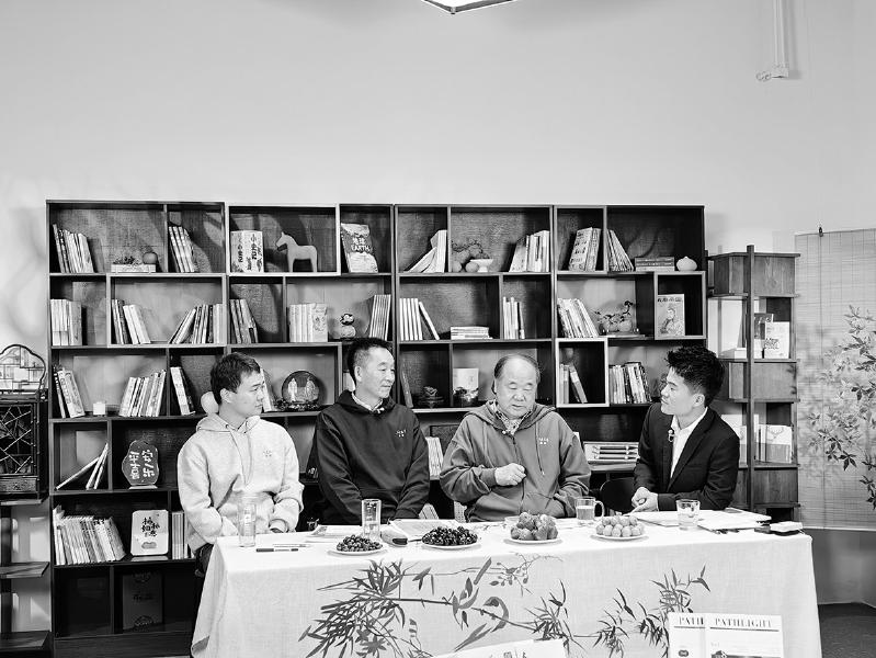 “在文學(xué)的曠野里”特別直播活動現(xiàn)場。從左至右為讀者張志方、《人民文學(xué)》主編施戰(zhàn)軍、作家莫言、“與輝同行”負責人董宇輝。 陳濤 攝