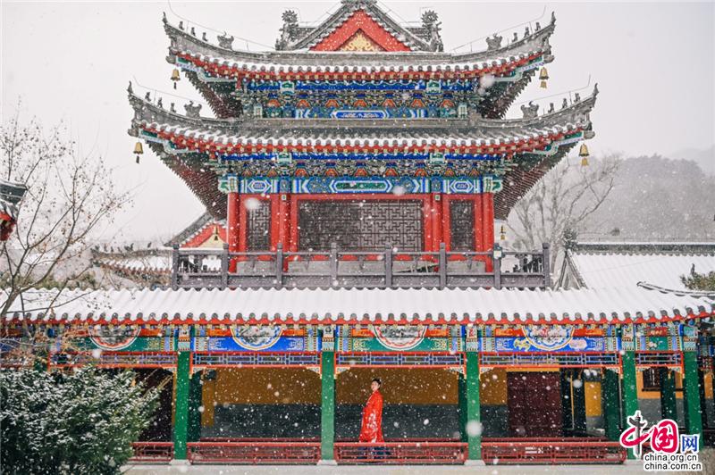 寺廟高處,古榕旁、雪地上,還有另一位古風裝束之人在彈奏古箏,聲意蕭瑟。伴隨空靈的山河意境,飄至遠方。冬季最美的畫面,也不過如此。