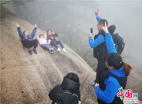 在得知蓮花峰關(guān)閉四個(gè)月后重新開放,上海游客宋先生和朋友專程來黃山爬蓮花峰,他說:“云霧時(shí)隱時(shí)現(xiàn),仿佛置身于仙境之中。登頂以后,看到蓮花峰非常高聳,非常壯觀,感覺到心神愉悅。”