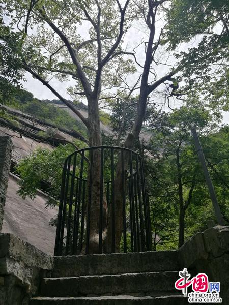 于是,我開始沿著陡峭的石階,一步一步地向上攀登。上不過百余級,一株如巨傘狀的天目紫莖躍然眼前。樹四周用茶杯粗細(xì)鋼筋柵欄緊緊圍住,可見景區(qū)對此珍貴名木的重視。仔細(xì)觀察,估計(jì)樹齡至少在500年以上,其主干樹皮細(xì)滑,骨感十足,上部枝丫自然舒展,覆蓋出去,周圍各色綠樹恰似眾星拱月般,與其相擁成趣。