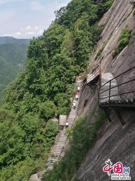 在走下第一級棧道的時候,我就暗暗告誡自己,上山容易下山難,一定不能樂極生悲,小心腳下,謹(jǐn)防腿軟滾摔。于是,我始終保持著有一只手扶著安全鐵護(hù)欄,一路扶著下階。來到平緩處,抬起手,竟然發(fā)現(xiàn)手上并沒有沾上多少鐵銹或灰塵。原來護(hù)欄上一溜光滑如新,可見來此攀登者并非少數(shù)。再者,在這天地盡皆干凈之處,塵埃自然沒有了蹤影。