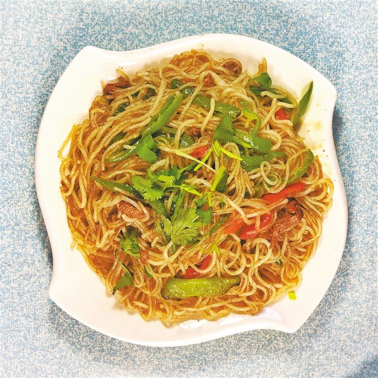 肉末粉條,是一道葷素搭配,鮮香爽口的家常菜。這道菜所用的水粉是由紅薯、馬鈴薯、大豆等原料加工制成的粉條。水粉是臨夏的特產(chǎn),它色白,條細,養(yǎng)分多,適于熬菜,烹炒和涼拌菜用,口感爽滑有韌性,頗受食客喜愛。
