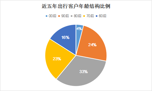 從年齡結構來看,中青旅遨游網(wǎng)近五年訂單數(shù)據(jù)顯示,80和90后年輕家長已成為出行主力軍,80后占比33%,90后占比24%;70后占比23%,60后占比16%。