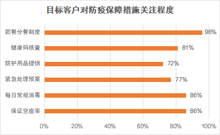 在旅游運營商選擇方面,區(qū)別于以往的“先看價格,再看服務”,客戶更關注“是否提供防疫保障,能否有效落實”。九成以上客戶表示,旅游過程中團餐應嚴格采用分餐制度,最大化保障用餐安全;八成以上客戶認為,需要嚴控旅游大巴空座率、做好日常消毒工作。