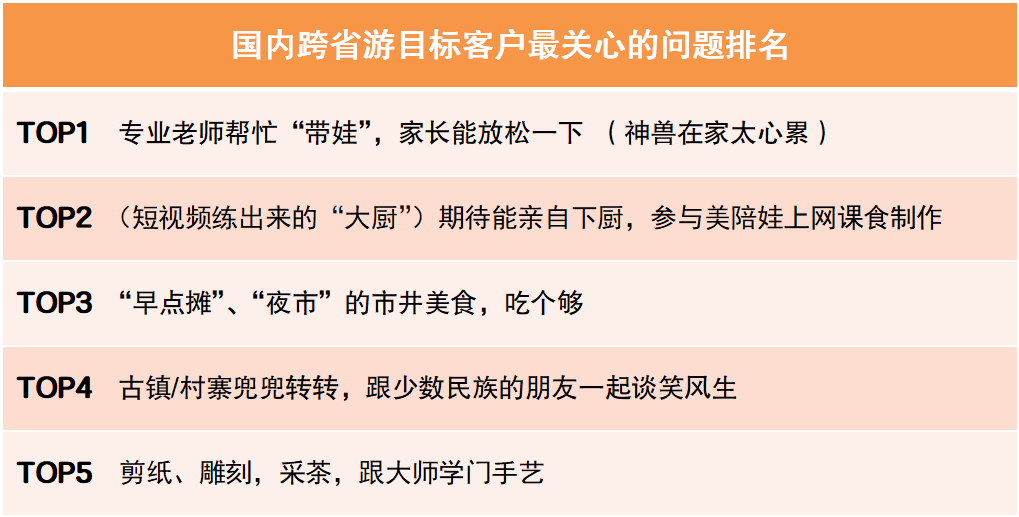 通過針對中青旅遨游網(wǎng)會員、中青旅聯(lián)盟成員單位的忠實客戶等群體的調研,以及近半年中青旅遨游網(wǎng)搜索、瀏覽的監(jiān)測數(shù)據(jù)進行綜合分析。結果顯示,西南和西北是客戶喜好程度最高的兩大地域;云南、江蘇、新疆、三亞、陜西是客戶喜好程度最高的五大熱門目的地。客戶最關心的問題,帶娃、參與、美食、閑逛、學藝則位列前五名。