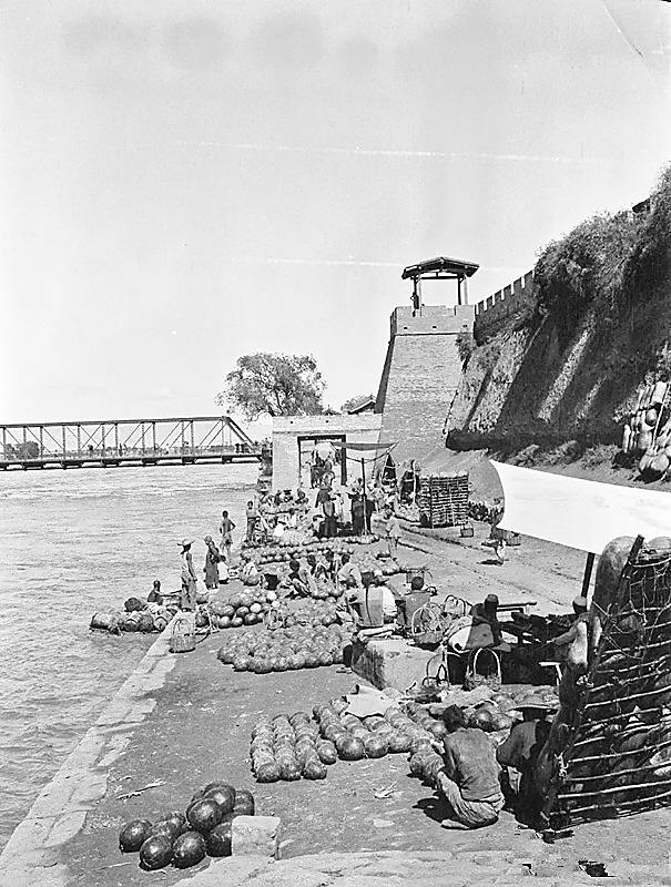 第三張照片,拍攝地點(diǎn)在黃河鐵橋附近,這是一處碼頭,一些人忙碌著卸西瓜,一些人靠著羊皮筏子等著人們渡河。小吃攤打著篷布,三三兩兩的人圍坐在那里,似乎是在吃釀皮子。照片上,遠(yuǎn)處是黃河鐵橋,看上去黃河水距離鐵橋的橋面比較近。由此看來,黃河的水量不小。