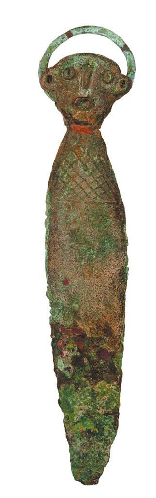 相比刀與叉,匕的出現(xiàn)要稍晚一些,甘肅省博物館收藏有人頭柄銅匕兩把,都是辛店文化(距今3400年—2800年)的產(chǎn)物,兩把人頭柄銅匕都采集于甘肅省廣河縣。一把人頭柄銅匕造型比較拙樸,匕身平直呈長舌狀,末端為圓弧形并微上翹。柄首為人頭形,高鼻,圓眼,厚唇微張,半環(huán)形雙耳,一耳殘缺。另一把人首柄銅匕同前一把人頭柄銅匕造型相似,但做工卻要精美許多,這把銅匕柄首也是人頭形,高鼻,圓眼,圓口,雙耳為半環(huán)形,頸部涂紅色,身體為方格網(wǎng)紋。這把人頭柄的人面雙目圓睜,嘴微張,一副機(jī)靈驚詫的表情,比前一把人頭柄銅匕人面憨直質(zhì)樸的面目更有意趣。這是兩把還沒成為武器的銅匕,但它已經(jīng)有了勺子的雛形。