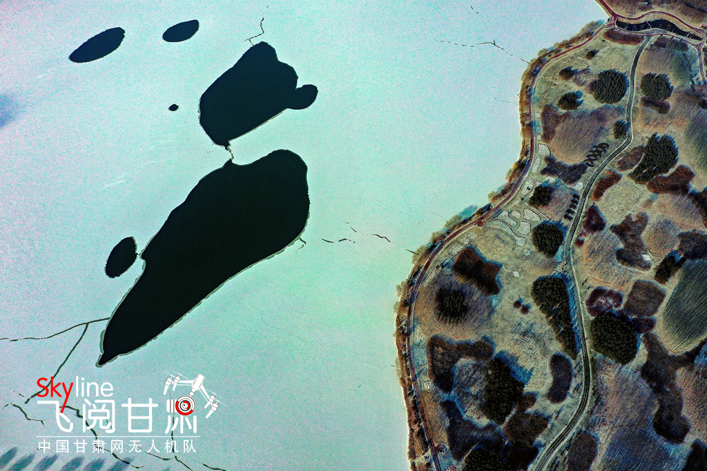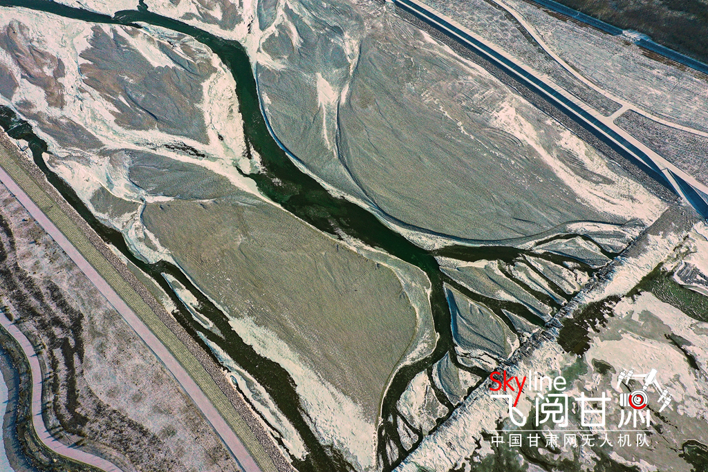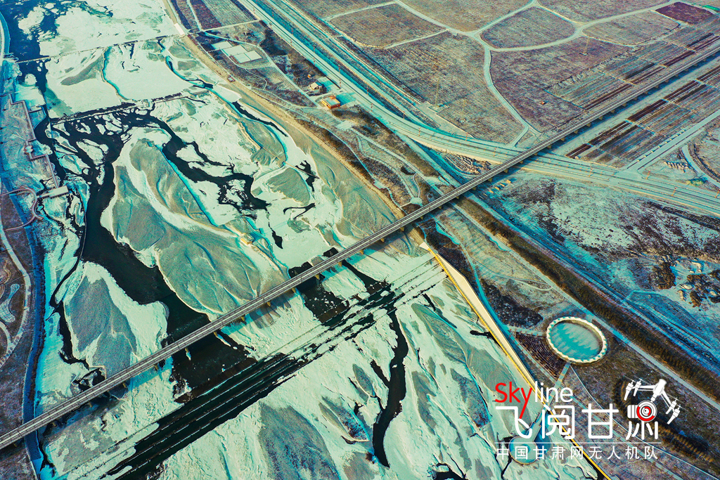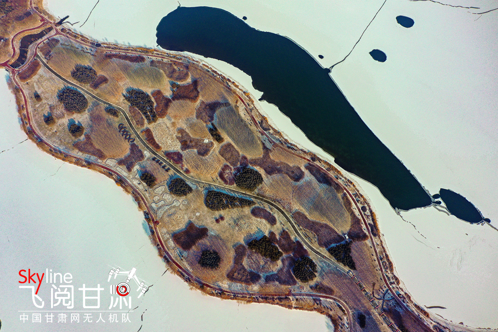 12月2日,雪霽天晴,冰封的黑河和漸凍的蘆水灣湖面上,皚皚白雪與裸露的水面形成丹青畫卷,別有一番趣味。(無人機(jī)照片)
