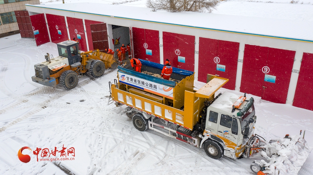 12月12日,甘肅省張掖公路局職工在裝運(yùn)融雪劑。(無(wú)人機(jī)照片)