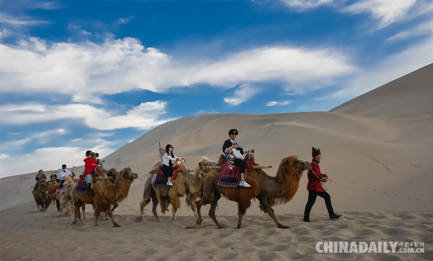 近日,來絲綢之路國際文化旅游名城甘肅敦煌游玩的游客,在騎駱駝暢游鳴沙山的過程中,驚異地發(fā)現(xiàn),這里牽駱駝的駝戶穿上了一種古裝戲中才有的“胡服”,戴一頂高高的帶有帽檐的駝色帽子,頓感大漠旅行情趣倍增,絲路風(fēng)情更加濃郁。