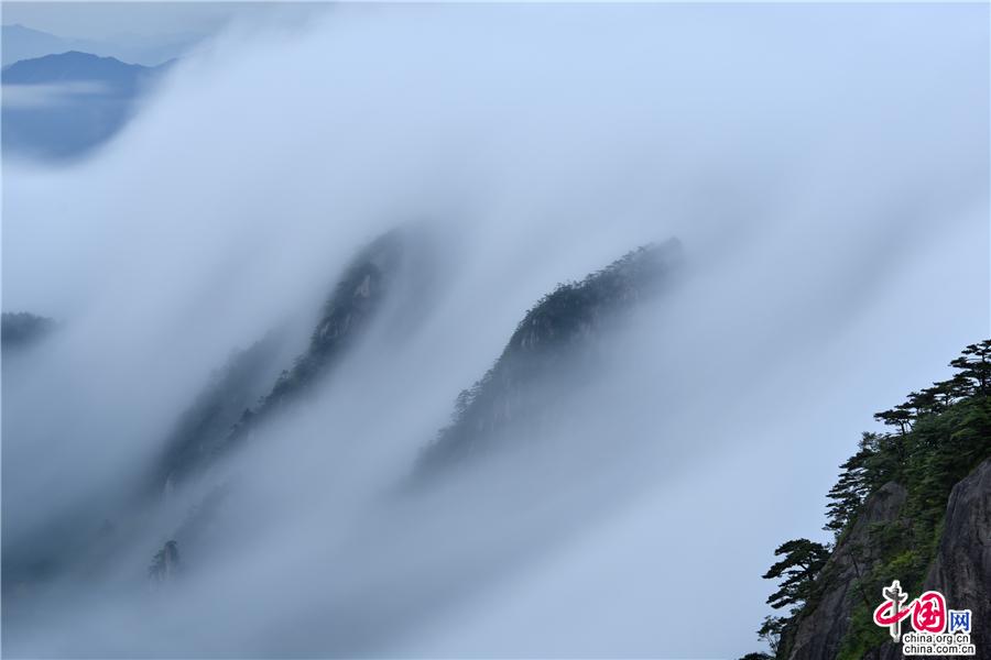 5月22日傍晚,雨后安徽黃山風(fēng)景區(qū)現(xiàn)壯觀的云海奇觀,見云海奔騰而來,越過北海的始信峰,沿著群峰傾瀉而下勢如瀑布之壯觀,在奇群、怪石和形態(tài)各異黃山松的作用下勾勒出一幅幅流動(dòng)的水墨畫;黃山不僅是云霧之鄉(xiāng),更是中國傳統(tǒng)水墨畫的天然的素材。(姚育青)