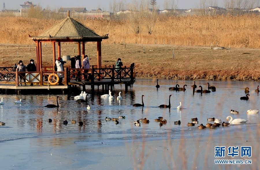 冬日清晨的甘肅省張掖國家濕地公園里碧波蕩漾,成群的白天鵝、黑天鵝等鳥類聚在一起游弋嬉戲,歡騰跳躍,成為一道亮麗的風(fēng)景線,吸引眾多游客觀賞拍照。新華網(wǎng)發(fā)(陳禮 攝)