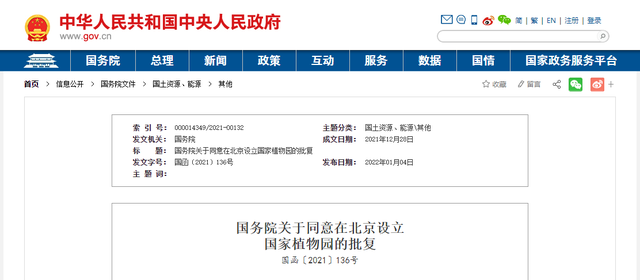 2021年12月28日,國務院公開發(fā)布《關于同意在北京設立國家植物園的批復》(以下簡稱《批復》)。《批復》稱,國務院已同意在北京設立國家植物園,由國家林草局、住房城鄉(xiāng)建設部、中科院、北京市人民政府合作共建。