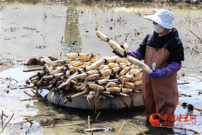 “我們就是東灘村人,在這個(gè)養(yǎng)殖場(chǎng)上班,離家近也方便,采藕一年下來能收入2萬多,平時(shí)還種地和外出打工,收入挺好的。”李愛芝一邊裝著蓮藕一邊說。