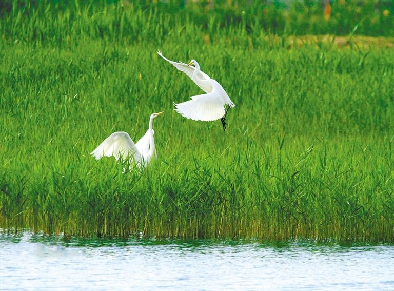 初夏的甘肅張掖國家濕地公園蘆葦青青,幾只白鷺在綠色的蘆葦中時而嬉戲飛翔,時而駐足覓食,成為濕地一道美麗風(fēng)景。 人民網(wǎng)照片