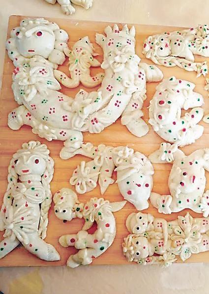 靜寧人的花饃饃,正是應(yīng)和了消病消災(zāi)、祈求平安的民間心理。端午禮儀中的面塑,表達(dá)著人們對美好事物的向往和祈禱。雖然是以食物的面目出現(xiàn),但那些充滿靈性的造型,卻飽含著人文的意蘊(yùn)。靜寧人塑成動物的面花中,最多的是蟾蜍和蛇。蛇面花多是盤成一團(tuán)的,沒有攻擊性又溫和的樣子。蟾蜍面花本地人叫“癩呱子”,形象很可愛,多的是兩只后足弧形對稱,蜷在腹部兩側(cè);兩只前足在頭頂相合,呈環(huán)抱姿態(tài)。也有別出心裁的婦女,會做出十二生肖之類的面花,這些面花,修飾并不夸張,其神韻更勝于外在的精致技巧。所有的端午面花都寄寓著大人們的祈福,但孩子們最喜歡的是動物面花,古靈精怪的,讓他們舍不得摸,更舍不得吃,只能與荷包一起掛在胸前賞玩,或與鄰家的小孩子一起比,看誰的媽媽手更靈更巧。