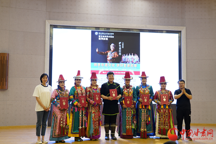 中國(guó)甘肅網(wǎng)7月1日訊 近日,甘肅裕固族歌唱組合薩爾組合主唱薩爾帶著他的裕固族伙伴們走進(jìn)西北師范大學(xué)音樂(lè)學(xué)院,進(jìn)行“課程思政教學(xué)實(shí)踐”——《裕固族民歌中的服飾文化》交流分享活動(dòng)。同時(shí),西北師范大學(xué)音樂(lè)學(xué)院副院長(zhǎng)晏曉東為七位裕固族民間音樂(lè)傳播者頒發(fā)了音樂(lè)學(xué)院聘書(shū)。