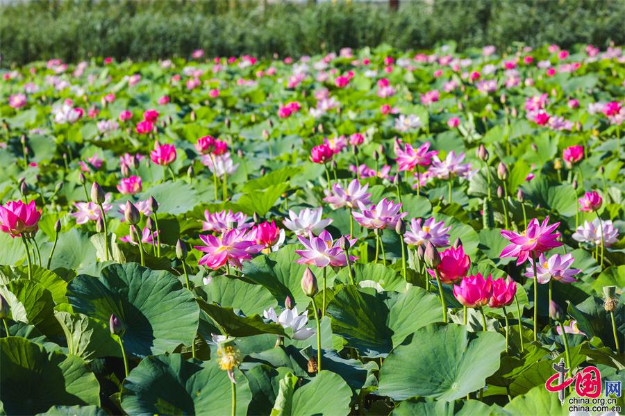 七八月份,正是荷花競(jìng)相盛開的季節(jié),寧夏沙湖景區(qū)利用淺灘和鹽堿地種植觀賞性荷花,在湖東游線深處打造了西北沙漠旁的“萬畝荷花苑”,為景區(qū)夏日增添一抹韻味。成片的荷花在西北的驕陽下熠熠生輝,構(gòu)成“接天蓮葉無窮碧”的塞上秀美荷塘景觀。
