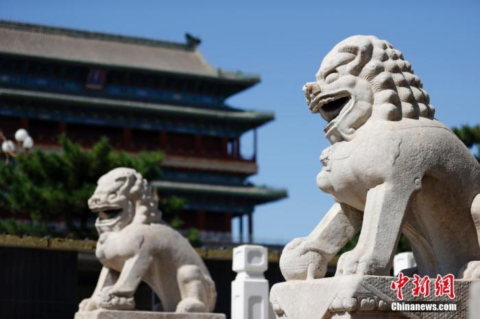 圖為北京正陽(yáng)門(mén)箭樓下的石獅雕塑。中新社記者 富田 攝