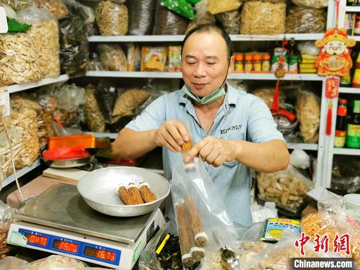 資料圖為廣東臺(tái)山富城市場(chǎng)內(nèi),一藥材檔的老板為顧客用密實(shí)袋打包參絲。 中新社發(fā) 李曉春 攝