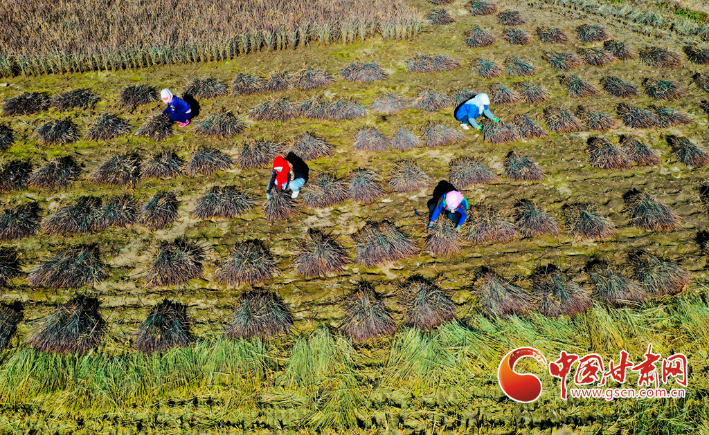10月21日,位于祁連山下的甘肅省張掖市甘州區(qū)烏江鎮(zhèn)新河田園綜合體內(nèi),農(nóng)戶們正在收割成熟的高原水稻。