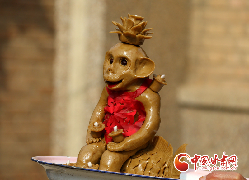 大面猴身上的面燈是專(zhuān)供一對(duì)新人來(lái)點(diǎn)的,所以面猴的做工尤為精心,在面猴的眼睛上還鑲嵌了明溜溜的黑豆,在胸前系著紅肚兜,看上去憨態(tài)可掬。