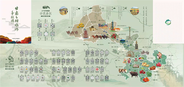 據(jù)介紹,手繪圖以“相約隴原促振興·富了口袋富腦袋”為主題,突出“圖文并茂、服務(wù)游客、便于攜帶、適于珍藏”等特點(diǎn),對(duì)2022年創(chuàng)建的6個(gè)鄉(xiāng)村旅游示范縣,60個(gè)文旅振興鄉(xiāng)村樣板村全部開發(fā)設(shè)計(jì)了電子“二維碼”,設(shè)置了甘肅省鄉(xiāng)村旅游60條四季精品線路,生動(dòng)形象地展現(xiàn)了甘肅鄉(xiāng)村旅游特色元素和資源產(chǎn)品信息,對(duì)幫助游客暢游甘肅鄉(xiāng)村、感知隴原文化、體驗(yàn)鄉(xiāng)村魅力具有重要意義。