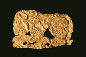 【虎噬羊紋金飾片·戰(zhàn)國·清水縣劉坪出土】工藝技法采用常見的錘碟法,在薄的金片的背面鏨刻虎形,正面隆起,邊緣剪切,四角有釘孔?;⒊识拙嵝?,眼、鼻、耳、嘴、齒、爪都十分清晰,虎張嘴,伸溝狀前爪抓住一羊。