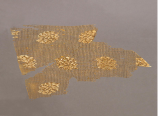 【粧金紗·元代·漳縣汪世顯家族墓出土】該墓葬中同時出土了許多元代的高級絲織品。此件粧金紗就是其中高級緞紋織物的一種。如棕色團(tuán)花粧金緞、粧金或銀天馬紋緞、粧銀簇花文緞等等。它不僅是罕見的早期緞物標(biāo)本,而且花色品種很多,非常珍貴。