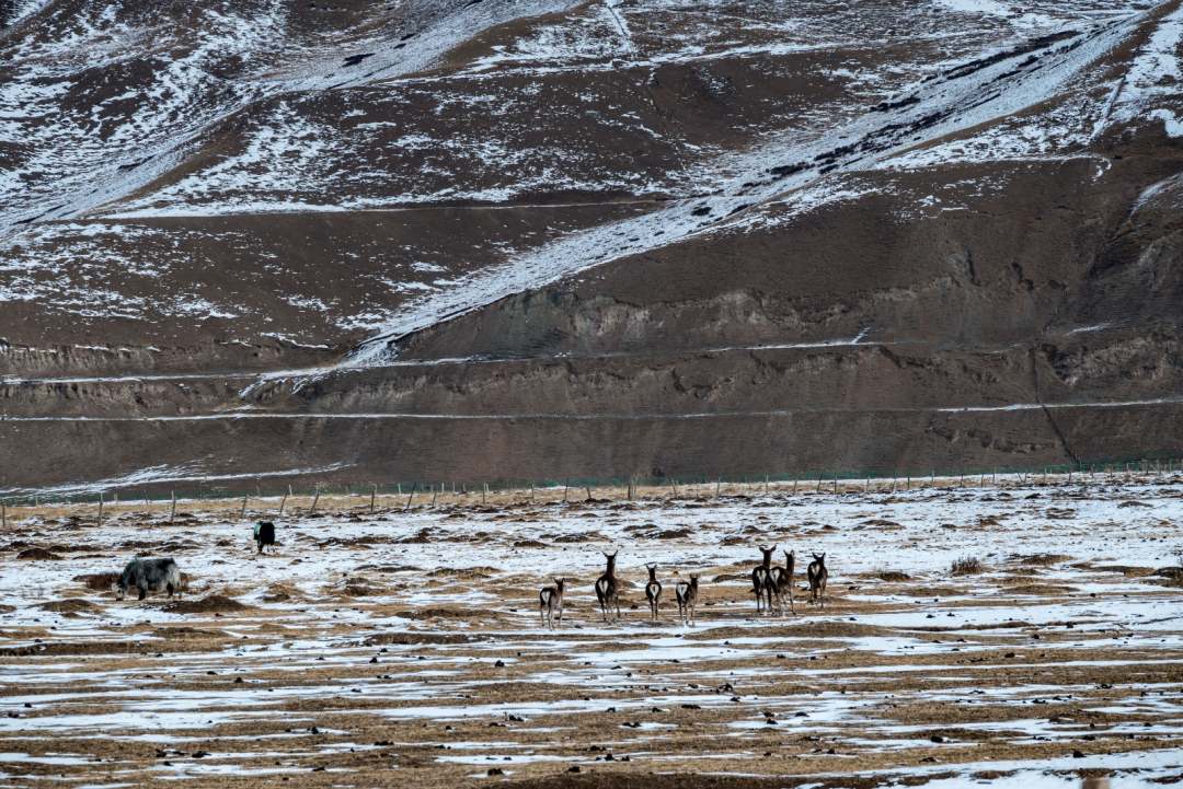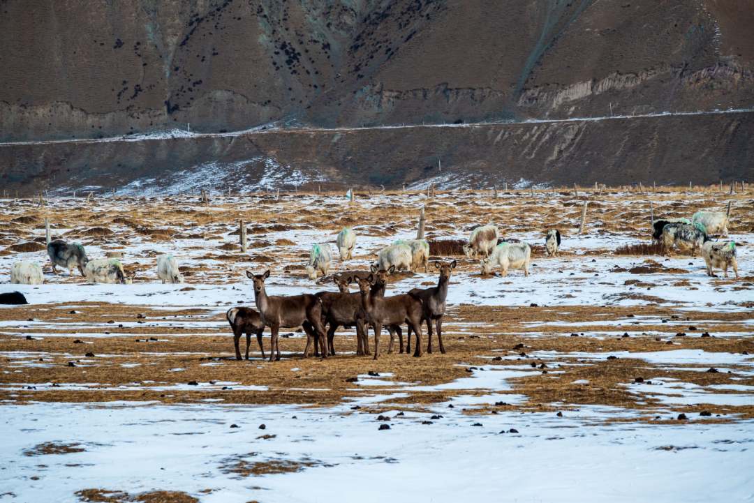近日,在武威市天祝藏族自治縣抓喜秀龍草原上,野生的狍鹿和牧民家養(yǎng)的白牦牛同食牧草,構(gòu)成一幅和諧動(dòng)人的自然圖景。張廷愛攝。