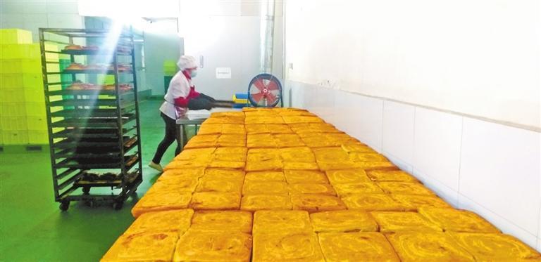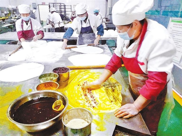 “揉面、搟面、抹餡料……”手工制作線上一位大姐告訴記者:“目前我們有手工生產(chǎn)和全自動生產(chǎn)兩條線,分別生產(chǎn)千層餅傳統(tǒng)面點和玫瑰餅等新型糕點。傳承祖上燒餅制作技藝,工人們要在前一晚和好面,面團(tuán)經(jīng)過一夜的醒發(fā)后,天剛亮再交由經(jīng)驗老到的師傅打堿,揉面、搟面,涂抹苦水玫瑰醬、胡麻顆粒、香豆粉、姜黃粉等餡料,卷制成型,在千層餅正面撒上芝麻,就可以上烤箱了,大約每天上午10點前烘烤好的千層餅會送往永登各銷售點。”