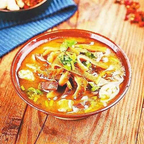 羊雜湯用煮羊肉的湯為原汁,放入切成細(xì)片的羊頭肉、羊肚、羊百葉,鮮湯加鹽、蔥白、香菜即可。西北的大蔥多用莖斜削,放于碗底,開水燙后香味溢出。西北人喝湯習(xí)慣加油潑辣子,紅紅的一大片,微辣不燥。