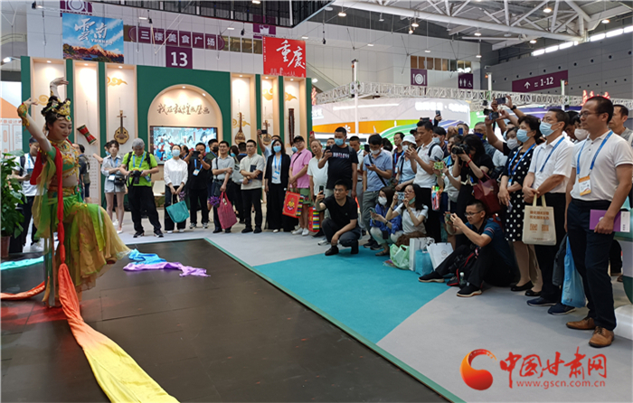 《絲路花雨》第二十一代英娘扮演者、青年舞蹈家康琦是深圳文博會(huì)甘肅文化形象大使,她也帶著《絲路花雨》精彩片段走進(jìn)如意甘肅館,用敦煌舞姿為甘肅代言。