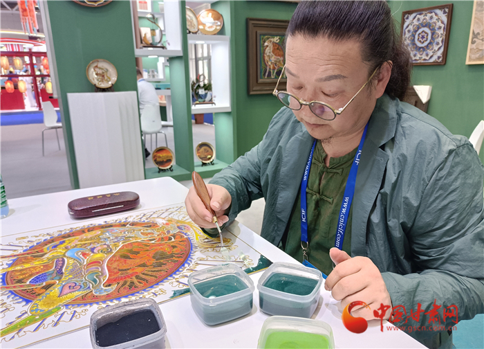 深圳文博會(huì)首日,李海明選擇現(xiàn)場(chǎng)制作九色鹿掐絲琺瑯畫(huà)。
