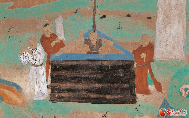 在宋代第55窟東壁門南側(cè)的金光明經(jīng)變右側(cè),有一幅壁畫,從上到下,將一個“流水長者子救魚”故事娓娓道來。