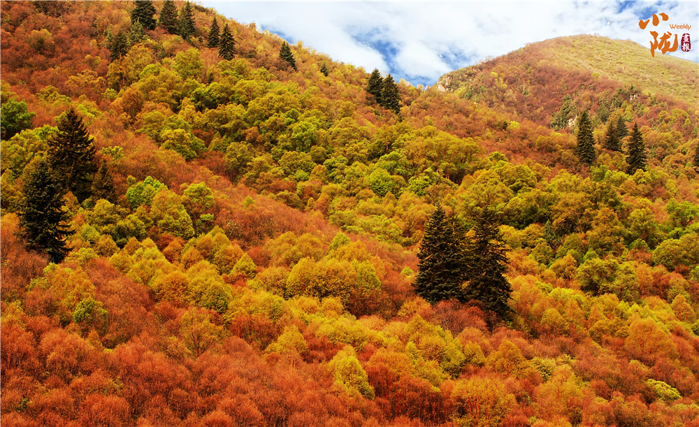 各種樹(shù)木依山勢(shì)成層密布,在金秋時(shí)節(jié)似浪花翻涌,山色隨著季相的變化依次呈現(xiàn)橙紅、嫩綠、碧黛和金黃,可謂層林盡染。