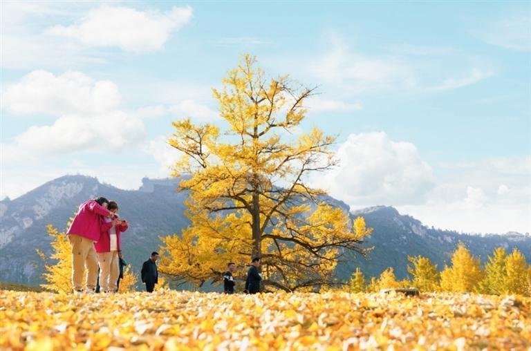 金秋時(shí)節(jié),走進(jìn)徽縣嘉陵鎮(zhèn)田河村,恍若走進(jìn)了金色的仙境。153棵古銀杏樹滿身金黃,一地落葉似“金色地毯”。銀杏樹下,品銀杏茶、吃銀杏果、享銀杏風(fēng)情,美不勝收,吸引眾多游客前來拍照打卡。如今,美麗風(fēng)景變身“美麗經(jīng)濟(jì)”,當(dāng)?shù)匾劳星赉y杏資源優(yōu)勢(shì),引進(jìn)“銀杏夢(mèng)谷”旅游項(xiàng)目,打造集旅游觀光、生態(tài)康養(yǎng)、休閑娛樂、農(nóng)特產(chǎn)品銷售為一體的美麗鄉(xiāng)村旅游示范點(diǎn),讓千年古樹煥發(fā)新的生機(jī)。本報(bào)記者 冉創(chuàng)昌 高瓊 攝