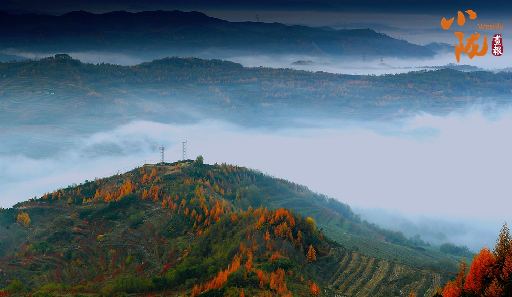 天空中布滿了烏云,云隙中的陽光和從四面八方漫過來的云霧、滿山彩林,把云華山點綴得像一幅筆墨清爽、疏密有致山水畫。