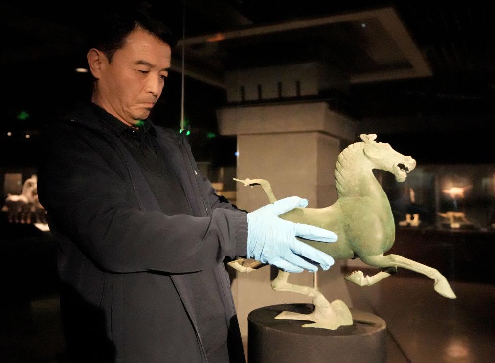 工作人員在甘肅省博物館展廳內安放銅奔馬(2023年10月27日攝)。新華社記者 王毓國 攝