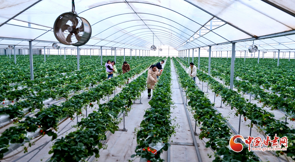 1月15日,甘肅省張掖市甘州區(qū)靖安鄉(xiāng)一草莓種植大棚內,游客正帶著小朋友采摘草莓。