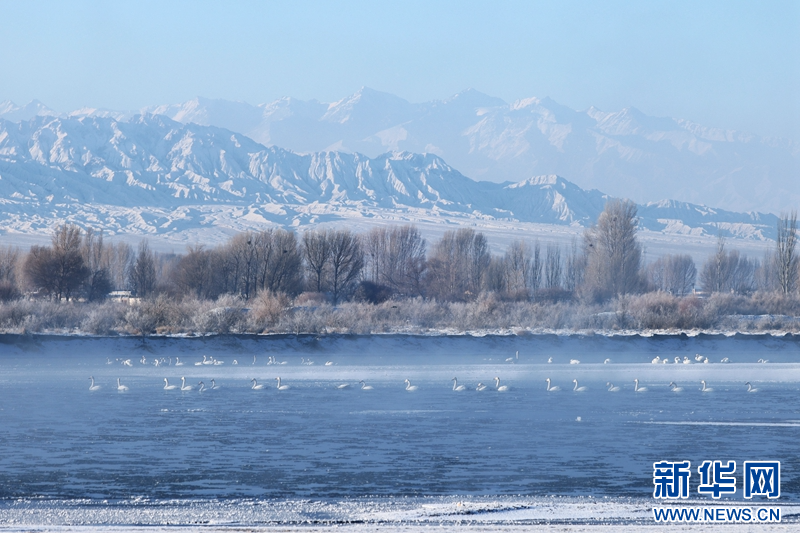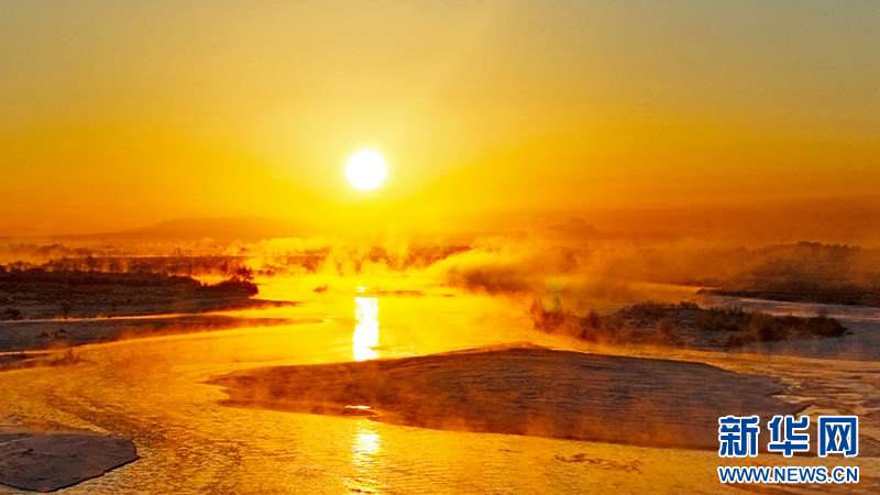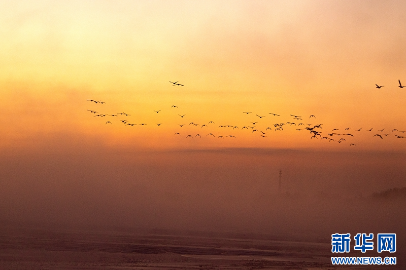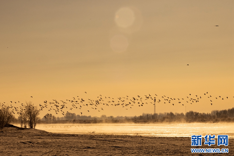 1月21日,冬日清晨,甘肅張掖黑河濕地日出如畫(huà)。一輪冉冉升起的紅日絢麗奪目,與河流、樹(shù)木、候鳥(niǎo)、晨霧共同構(gòu)成了一幅生態(tài)畫(huà)卷。新華網(wǎng)發(fā)(成林 攝)