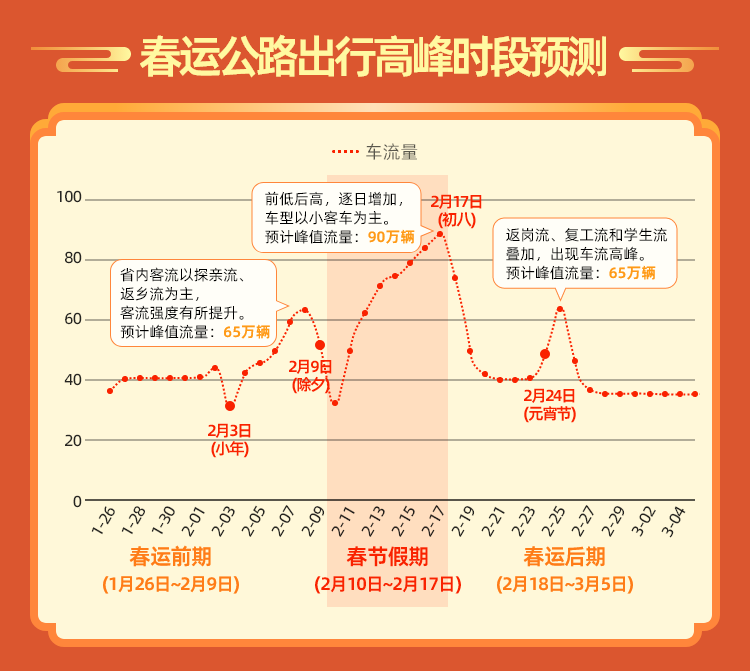 春運前期(1月26日至2月9日):省內(nèi)客流以隴南、天水、嘉峪關(guān)、武威、平?jīng)龅确较虻奶接H流、返鄉(xiāng)流為主,客流強(qiáng)度有所提升,跨省客流以出疆途經(jīng)甘肅返回內(nèi)地的返鄉(xiāng)流為主,出現(xiàn)節(jié)前自西向東的潮汐現(xiàn)象。預(yù)計2月8日(臘月二十九)國省道路交通流量較大,公眾出行迎來集中高峰。此外,受群眾采辦年貨、休閑逛街、中短途探親訪友以及大型活動等多種因素影響,各市城區(qū)貨物市場、繁華商圈等周邊區(qū)域以及部分主干道路,將出現(xiàn)一定的交通壓力。